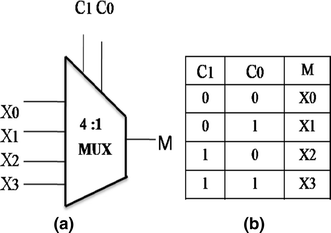 It quite often happens, in the design of large-scale digital systems, that a single line is required to carry two or more different digital signals. Of course, only one signal at a time can be placed on the one line. What is required is a device that will allow us to select, at different instants, the signal we wish to place on this common line. Such a circuit is referred to as Multiplexer. The graphical symbol and truth table of 4:1 MUX are shown in Fig. 1a, b, respectively. A multiplexer performs the function of selecting the input on any one of 'n' input lines and feeding this input to one output line.