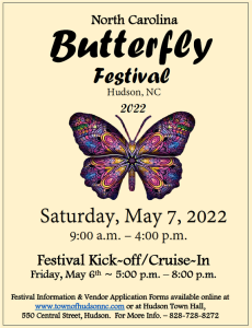 The Hudson Butterfly Festival is the oldest festival in Caldwell County. The festival will feature arts, crafts, food & drink from area vendors, dandy entertainment, and plenty of children's activities. The importance of this consequence is to honor the butterfly and its contribution to the environs. At the festival, you'll have the opportunity to visit the Monarch Instruction Table and the Butterfly Tent, which is filled with butterflies. You can acquire which plants to place in your k to help…