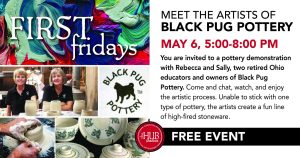 First Fridays Art Demonstration with Black Pug Pottery May half-dozen, 5:00-8:00 PM You are invited to a pottery sit-in with Rebecca and Sally, two retired Ohio educators and owners of Black Pug Pottery. Unable to stick with one type of pottery, the artists create a fun line of high fired stoneware, Pet Lover Mugs & Stuff. Drib past and say How-do-you-do!