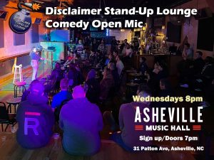 Disclaimer Stand up-up Lounge is the longest running comedy open mic in Asheville happening every Wednesday night. The show starts at 8:00, and there is no encompass. Anyone wanting to perform needs to tin can sign upward starting at 7pm, and will become five minutes on stage. Local and non-so-local, professional and not-so-professional person comics perform or just anyone wanting to get upwards in front of people and try to make them laugh. E'er fun. Ever gratuitous.